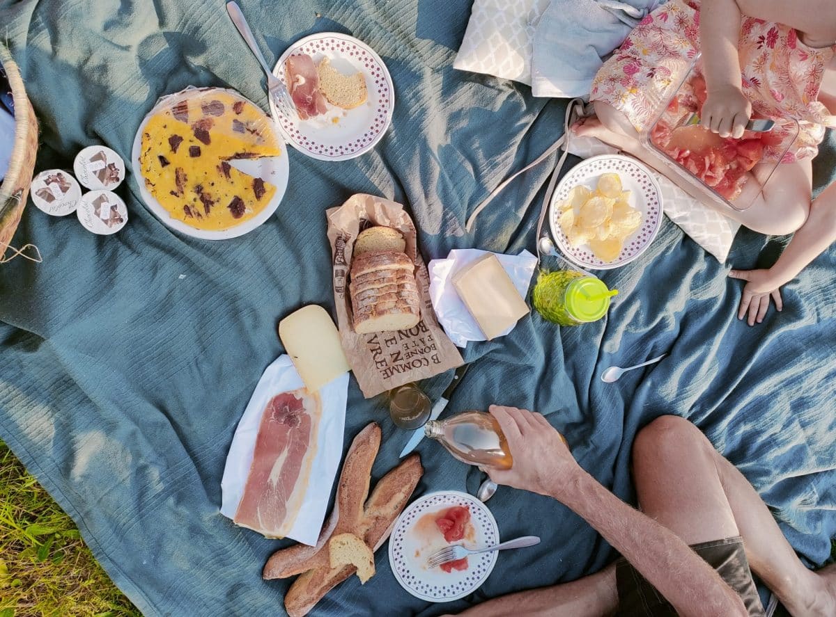 Hmmmm c’est bon ! Pain local, jambon de porc noir de Bigorre, tomates du jardin, fromage des Pyrénées, jus de pomme local, yaourts locaux et gâteau maison, le régal pour un pique-nique 100% local que les enfants dévorent. A l’ombre de la forêt ou avec la vue sur la chaîne des Pyrénées, du printemps à l’automne, on aime manger en pleine nature.